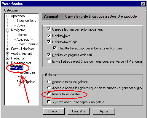 Com eliminar cookies (galetes) i impedir-les des de Netscape Per a concloure aquest article podem fer una neteja del directori COOKIES del nostre disc dur. És dintre de la carpeta de Windows i conté fitxers que guarden determinats paràmetres útils per a recollir informació de l'usuari (és a dir, el teu) quan navegues per Internet. Simplement s'ha d'esborrar el contingut d'aquesta carpeta. Les cookies són "trossos" de programes que alguns llocs WEB envien als usuaris que es connecten per a fer la navegació més ràpida, emmagatzemar preferències o qualsevol altra informació que els sigui útil. Vist així, semblen una gran cosa però també es poden utilitzar per a extreure informació sobre l'usuari, de la seva màquina, els seus arxius... sense que aquest ho sàpiga, a més de poder arribar a actuar com autèntics virus. És per això que les cookies no estan molt ben "vistes" a pesar de la seva indubtable utilitat. Per a eliminar les cookies que tinguem emmagatzemades en el nostre Netscape, esborrarem el contingut de la carpeta on es guarden. Aquesta carpeta estarà situada on tinguem emmagatzemat el nostre perfil de correu, que normalment serà: Disc local C: ' Carpeta "Arxius de Programa" ' "Netscape" ' "Users" ' "< el nostre perfil d'email> " ' "Cache" Si esborrem el contingut de la carpeta, esborrarem les cookies. És possible que per a accedir a la carpeta "Arxius de Programa" ens demani específicament mostrar els arxius. Li direm que si. Per a impedir que es tornin a instal·lar en la nostra màquina, indicarem al Nestcape que les rebutgi. Per a això, des del menú "Edita" ' "Preferències" escollim l'opció "Avançat":