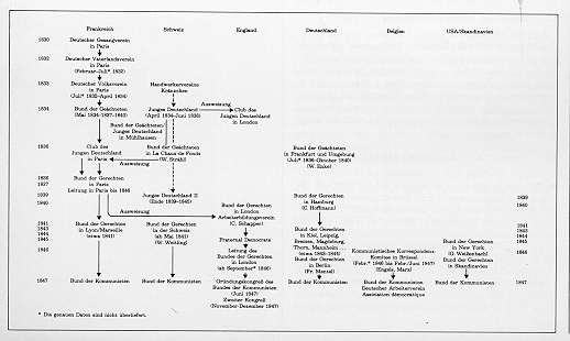 Gestació de la Lliga dels Comunistes, que té l'origen en la Societat Coral Alemanya de París, esdevinguda Societat Patriòtica i posteriorment Societat Popular, Lliga dels Proscrits, Club dels Joves Alemanys de París, Lliga dels Justos i, finalment, Lliga dels Comunistes.