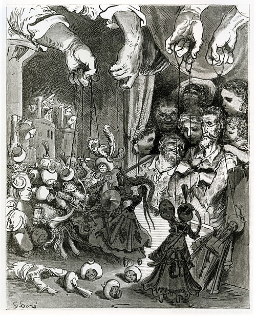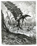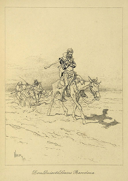 Nadie como Gustave Doré (1832-1883) supo reflejar los sueños de don Quijote, la realidad que le rodeaba y el contraste entre ambas en composiciones grandilocuentes y rotundas, que transmitían a la perfección su deseo de gloria, su desánimo, su sufrimiento o la profundidad de su melancolía. Estas estampas han sido, sin duda, las más populares (como muestra el hecho de que la imagen arquetípica de los protagonistas sea, para la mayoría de los lectores, la que realizó este autor), y aún hoy se siguen reproduciendo con éxito. Aparecieron por primera vez en una traducción francesa de 1863.