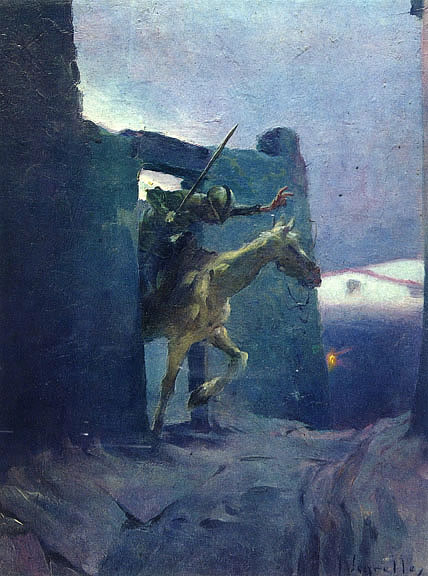 José Segrelles (1885-1969) dedicó toda su vida a ilustrar el Quijote pues, aunque empezó su labor en 1918, no publicó todo el conjunto hasta 1966. Eso hace que en sus composiciones se combinen diferentes estilos y tendencias, desde el realismo al impresionismo o las vanguardias. Aunque en ocasiones se apega a los modelos tradicionales, su imaginación se muestra fértil a la hora de buscar episodios nunca ilustrados. Sabe llenar la lámina con pocos elementos, siempre en movimiento o inestables, creando fuertes contrastes entre colores o entre luces y sombras.