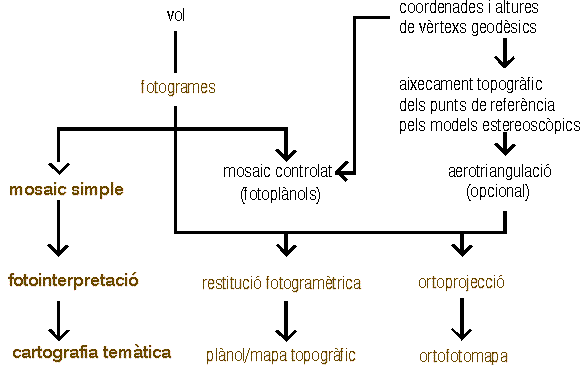 Majoritàriament, els vols fotogràfics es realitzen per a la producció de cartografia topogràfica i d'ortofotomapes. La metodologia i els procediments propis d'aquests treballs es coneix amb el nom de fotogrametria. És un dels continguts fonamentals dels estudis de topografia i d'enginyeria geogràfica. A manera de guia general, examineu l'esquema següent sobre els productes que resulten dels vols. Els mapes topogràfics i els ortofotomapes interessen com a document final però no pas pels procediments de producció.