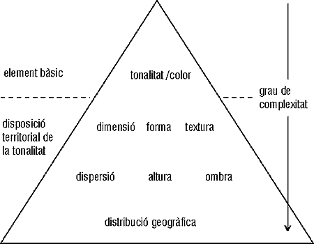 En un primer nivell, l’observador advertirà el contrast entre les tonalitats de grisos o de color. Per exemple: les zones boscoses son més fosques que les parcel·les llaurades sense conreu.