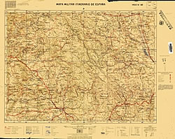La cartografia militar realitzada durant el conflicte va ser de dos tipus: topogràfica i itinerària, tal com s’ha explicat en l’apartat sobre la producció cartogràfica durant la guerra. En els fons de la Cartoteca hi trobem documentació significativa d’ambdues tipologies. De la sèrie que va tenir una major producció i difusió, el Mapa Topográfico 1:50 000, s’han digitalitzat cinquanta-un fulls, publicats entre el 1936 i el 1939, amb exemples editats tant pels republicans com pels franquistes (i el Corpo Troupe Volontarie italià). La col·lecció en paper, però, és una mica més extensa, ja que no s’han digitalitzat aquells fulls que es trobaven prèviament disponibles en d’altres col·leccions accessibles en línia.