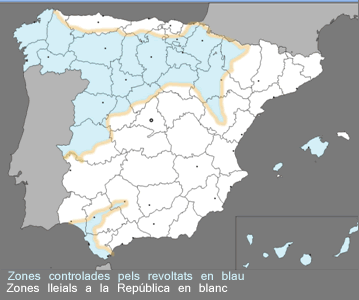 Dins aquest segon grup van començar a créixer una sèrie de moviments conspiradors per enderrocar el govern, amb el suport, entre d’altres, d’una sèrie de generals africanistes que veien com bona part dels seus ascensos quedaven anul·lats. El pla inicial d’aquest grup de generals era fer confluir a Madrid quatre divisions peninsulars, més una provinent del Marroc, i fer-se amb el poder. La posada en pràctica no va donar els fruits esperats: ni la quantitat ni l’envergadura de les tropes previstes va arribar a Madrid, on el govern va decidir finalment armar les milícies populars (militants i simpatitzants dels sindicats i dels partits d’esquerres) per oposar-se als rebels. Com a resultat, a pocs dies del cop d’Estat, Espanya va quedar dividida : la zona nord-oest (a excepció de la franja cantàbrica) i una franja al sud oest d’Andalusia eren rebels (blau al mapa), juntament amb la part colonial d’Àfrica; a la resta de l’Estat, el cop no havia prosperat (blanc al mapa). No obstant, el govern de la República va trobar-se amb un altre front: la revolució social sorgida dins el seu propi territori.