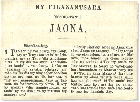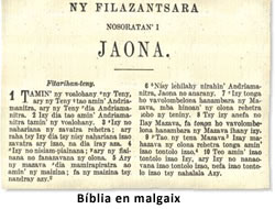 Los misioneros utilizan la lengua con fines propagandísticos, tanto políticos como religiosos, traduciendo la Biblia en malgache (1833) y difundiendo una producción considerable de textos científicos, didácticos, escolares y de lectura, además de los religiosos. La pasión malgache por el canto llevó también a los misioneros a componer cánticos en malgache a partir de conocidas partituras religiosas inglesas. Después de su expulsión, bajo el reinado de Ranavalona I, los cristianos siguieron reuniéndose de manera clandestina para rezar y cantar, desarrollando composiciones poéticas propias. En estas composiciones, mayoritariamente anónimas, se subrayan la fe en la vida eterna y la confianza en Dios para poder superar las duras pruebas de la existencia. Al finalizar el reino de Ranavalona I en 1861, el país abre de nuevo sus puertas a los misioneros. Las congregaciones protestantes, luteranas, anglicanas y católicas editan volúmenes de cánticos religiosos y, bajo el impulso de los misioneros protestantes, adaptan la métrica europea a los cantos malgaches. Se instaura la Sekolin’ ny efapolo lahy, escuela que formaba a pastores y administrativos, y las revistas asisten a los pastores en su labor proporcionándoles modelos de sermones. La separación entre la iglesia y el estado que conllevó la colonización debilitó la fuerza de la primera, que tuvo que poner a prueba su inventiva para encontrar otras vías de ganar fieles. Cuando Victor Augagneur sustituye a Gallieni en 1905, la separación entre la iglesia y un estado laico y librepensador que posee su propia tribuna en la prensa se convierte en rivalidad. Con la aparición del diario Basivava (El charlatán) en 1906, surge un círculo literario de poetas ávidos de novedades y de progreso. Uno de ellos, Rainizanabololona, conocido como Júpiter, modifica algunos aspectos de la métrica establecida por los misioneros en un intento por acercarla más a la sonoridad y al ritmo de la lengua malgache. Los autores cristianos encuentran en el relato breve un instrumento aún más eficaz que los artículos de reflexión, que corrían el riesgo de ser censurados si eran demasiado explícitos. Siguiendo el modelo del célebre Pilgrim’s Progress de John Bunyan, anteriormente traducido al malgache, estos relatos narran el combate del cristiano contra el pecado y, sobre todo, la destrucción que conllevan los vicios y el librepensamiento. Los partidarios de este último contraatacan en el diario Masoandro (Sol) proponiendo, en un estilo más directo, historias que atraían a los lectores hacia las realidades del mundo y del amor.