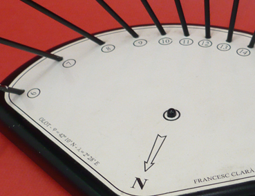 Orientat al Nord, cada gnòmon fa la seva pròpia ombra. I la que marca l’hora en cada moment és la que passa per la boleta negra que hi ha al centre de la plataforma.