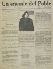 UN ENEMIC DEL POBLE: FULLA DE SUBVERSI脫 ESPIRITUAL. 1917-1919. Barcelona. N煤mero: 9, desembre de 1917 i n煤mero 16, mar莽 de 1919. Va ser una iniciativa de Joan Salvat-Papasseit. Abra莽ant el progressisme social i l鈥檃narquisme fortament influenciat per Nietzsche, aquesta va ser la publicaci贸 a la qual s鈥檈ncarreg脿 d'estampar alguns dels primers poemes avantguardistes; entre ells 鈥淐olumna vertebral: sageta de foc鈥 o 鈥54045鈥. En contrast amb les imatges de portada, es trobava la cap莽alera, s貌bria i estrictament tipogr脿fica, que se situava sempre en el mateix espai de la coberta, per貌 amb font canviant. |