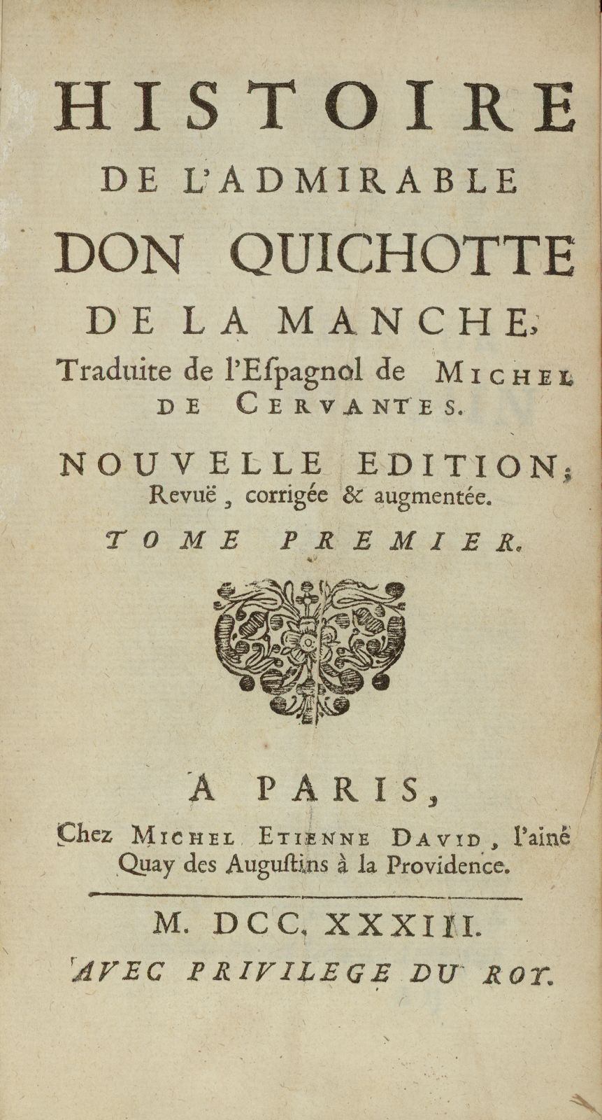 Traducción al francés de François Filleau de Saint-Martin (1632-c. 1695).― Ilustraciones de François Bonnard (fl. 1730-1748) inspiradas en los dibujos de Charles-Antoine Coypel (1694-1752), grabadas, entre otros, por Laurent Cars (1699-1771) y Louis Crépy (fl. 1730-1746).