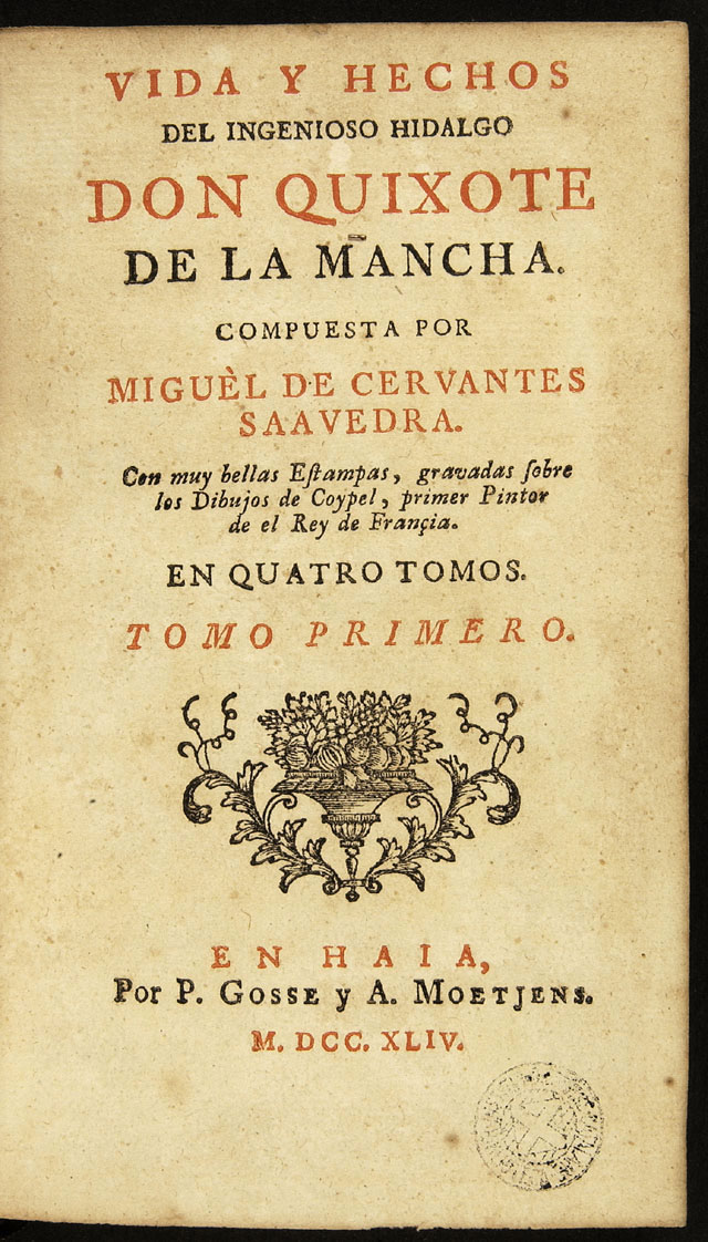 Primera edición en castellano con calcografÃas inspiradas en los dibujos de Charles-Antoine Coypel (1694-1752), grabadas por Jacob Folkema (1692-1767), Simon Fokke (1712-1784) y Pieter Tanjé (1706-1761).
