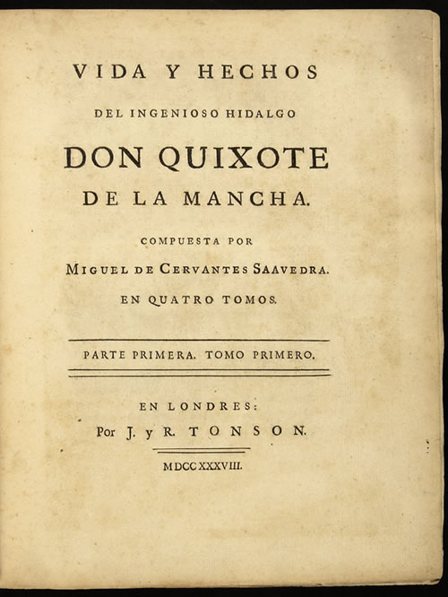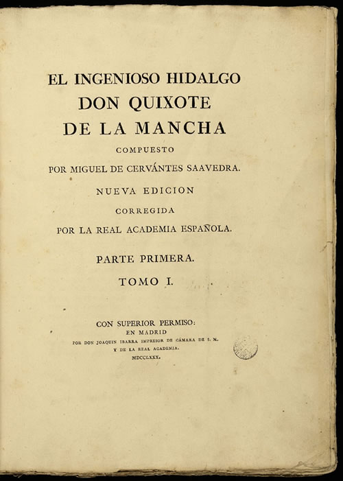 Primera edición de la Real Academia Española.― Ilustraciones de Antonio Carnicero (1748-1814), José del Castillo (1737-1793), Bernardo MartÃnez del Barranco (1738-1791), José Brunete (1746-¿?), Gerónimo Antonio Gil (1731-1798) y Gregorio Ferro (1742-1812), grabadas por José JoaquÃn Fabregat (1754-1807), Francisco Muntaner (1743-1805), Fernando Selma (1762-110), JoaquÃn Ballester (1740-1795), Manuel Salvador Carmona (1734-1820), Pedro Pascual Moles (1741-1797), Juan Barcelón (1739-1801) y Gerónimo Antonio Gil (1731-1798).― Ejemplar encuadernado por Antonio de Sancha (1720-1790).― El dibujo encargado a Francisco de Goya (1746-1828), grabado por José JoaquÃn Fabregat, finalmente no fue incluido en la edición.