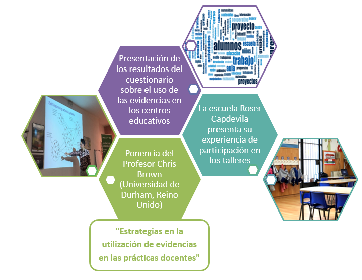 Durante la jornada se han presentado los resultados del cuestionario sobre el uso de las evidencias en las prácticas educativas, administrados durante el curso pasado, se han presentado ejemplos de buenas prácticas de los centros participantes y se ha reflexionado sobre estrategias que fomentan el uso de las evidencias. Durante la jornada, el prof. Chris Brown, miembro del equipo de investigación, presentó una ponencia titulada: "Estrategias en la utilización de evidencias en las prácticas docentes".