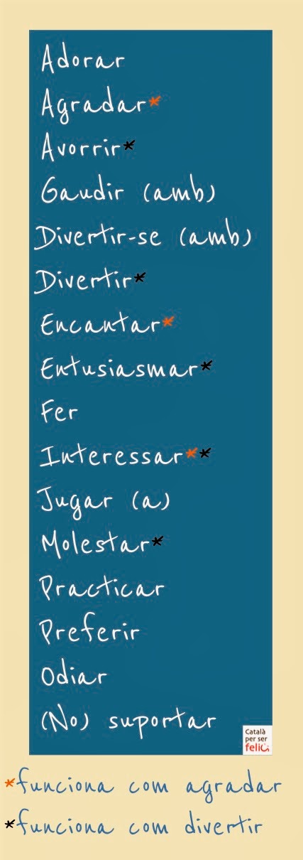 El verb agradar és, probablement, el més popular d’un grup de verbs que usualment funcionen d’una manera diferent i que són anomenats verbs psicològics. Aquests verbs expressen el sentiment o la sensació d’una persona en relació amb algun objecte, i, normalment, es conjuguen d’una manera diferent a la resta. Encantar, interessar, plaure o molestar són alguns exemples d’aquest tipus de verbs que avui posarem en pràctica.