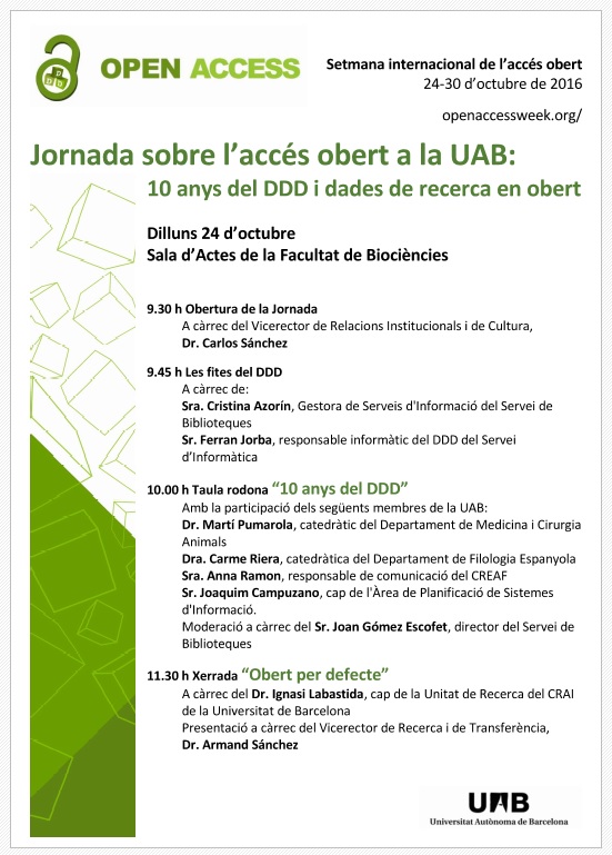 Com ja sabeu, des de fa uns anys la Universitat Autònoma de Barcelona encoratja als seus professors, investigadors i alumnes perquè dipositin tota la seva producció científica en accés obert a través del Dipòsit Digital de Documents (DDD) de la UAB. Amb l’objectiu de donar suport a tota la comunitat universitària en aquesta matèria, la UAB proporciona tota la informació necessària a través de la pàgina web sobre Accés Obert, així com també s’ha habilitat un blog d’atenció a l’usuari en matèria de Propietat Intel·lectual i Accés Obert.