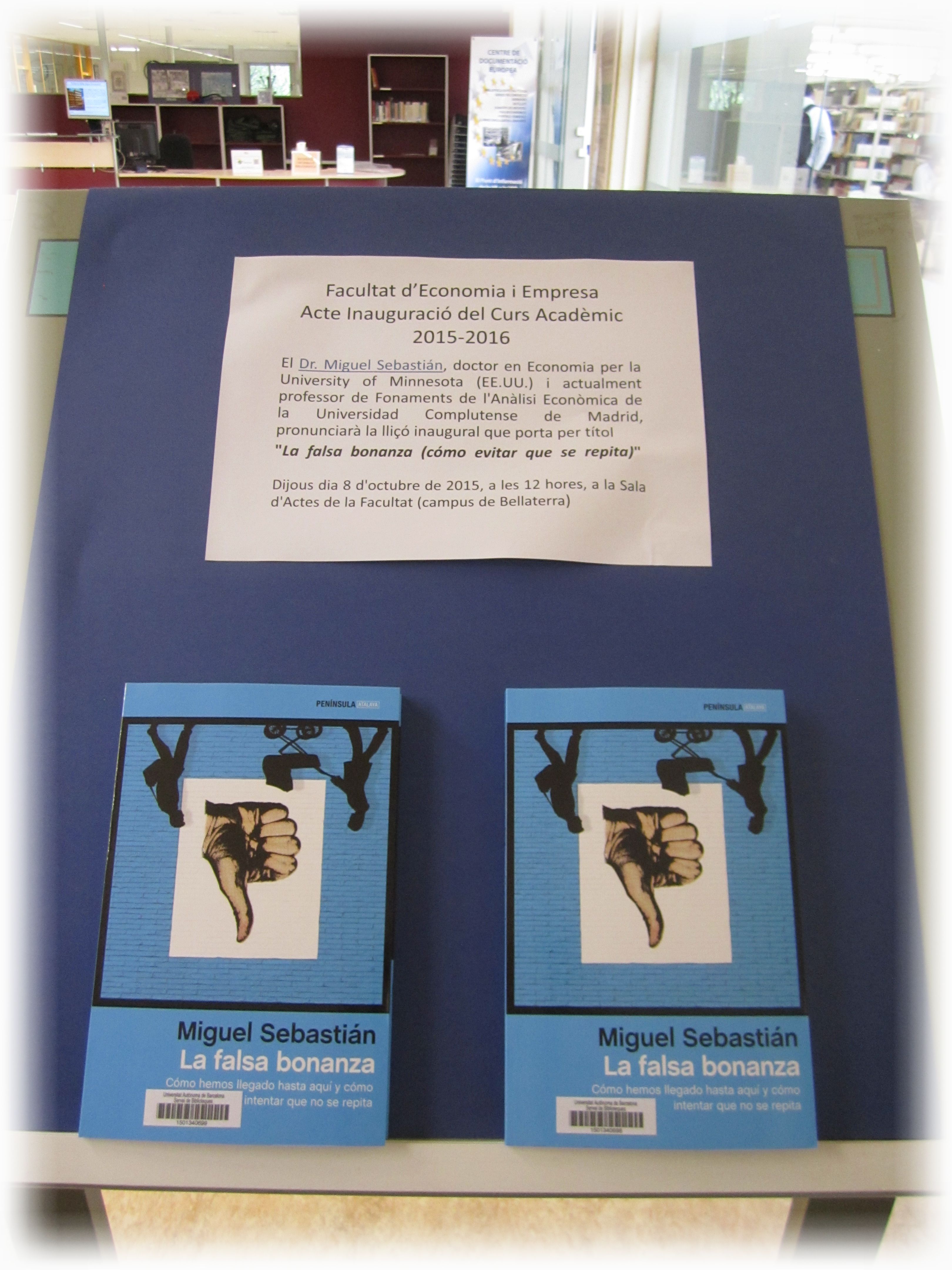 L’acte d’inauguració del curs acadèmic 2015-2016 de la Facultat d’Economia i Empresa té lloc el 8 d’octubre, a les 12 h, a la sala d’actes de la Facultat. Comptarà amb la presència del Dr. Miguel Sebastián, professor de Fonaments de l’Anàlisi Econòmica de la Universidad Complutense de Madrid, qui pronunciarà la lliçó inaugural, que porta per títol “La falsa bonanza (cómo evitar que se repita)“. Sebastián és doctor en Economia per la University of Minnesota (EUA) i va ser ministre d’Indústria, Turisme i Comerç.