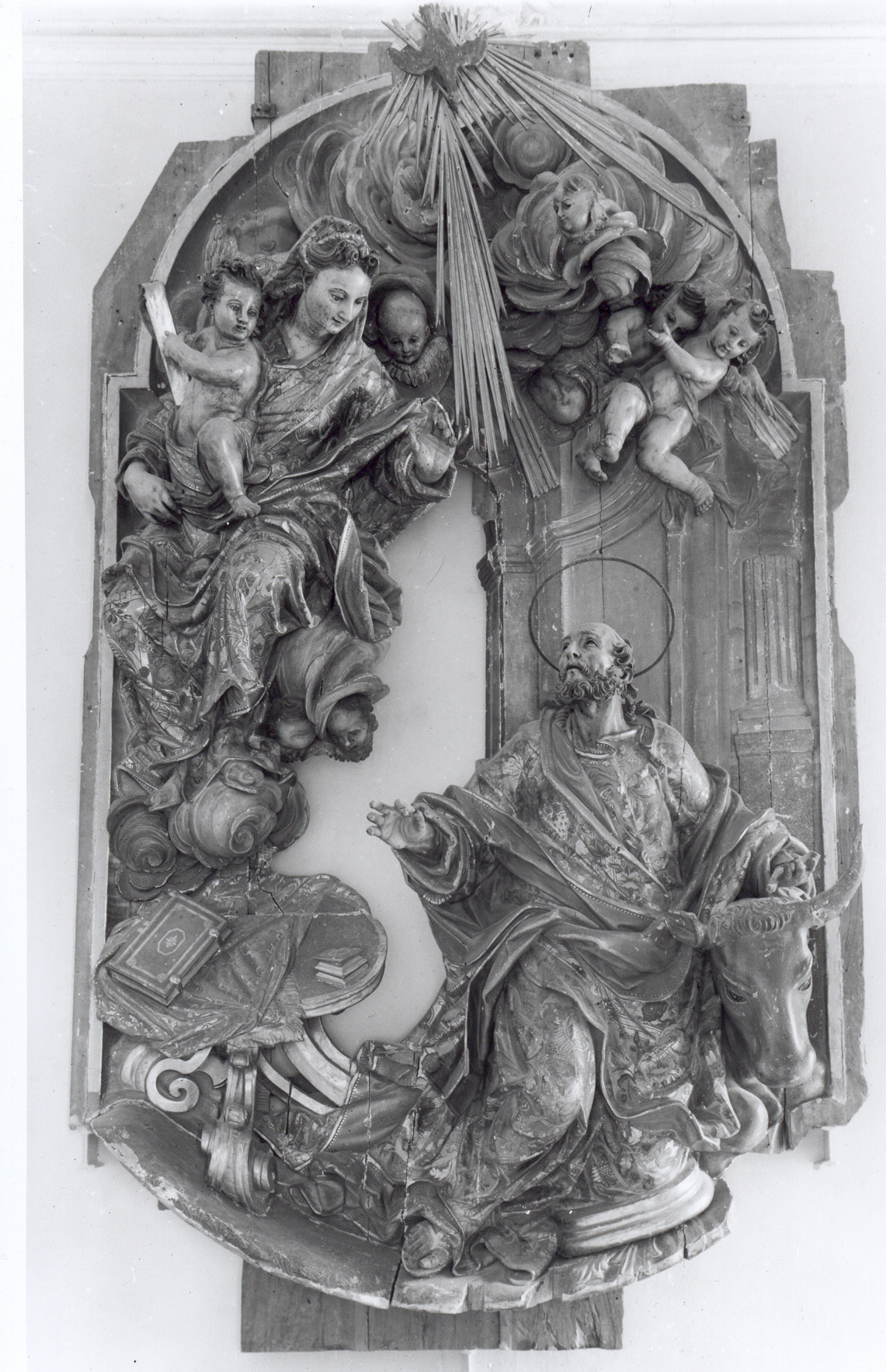 El relleu de l'Aparició de la Verge, obra de Jacint Morató, és un dels pocs fragments conservats (no en la seva totalitat) del desaparegut retaule de Sant Lluc de Girona. La seva fàbrica s'ha d'inscriure en la mateixa cronologia de la construcció del retaule (1727-1729).