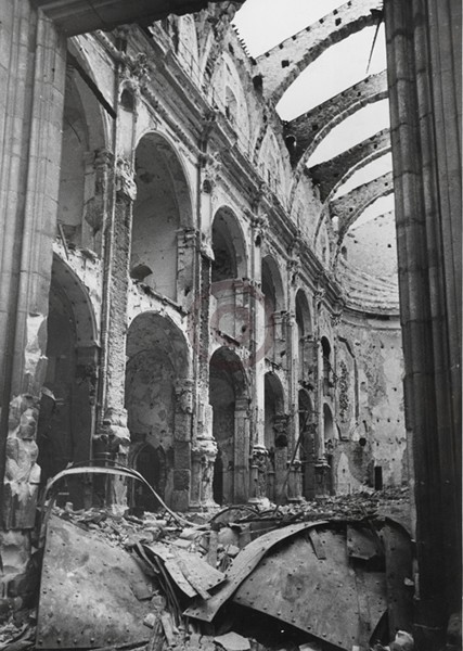 Imatge de l'interior de l'església de Nostra Senyora de Betlem, després de la destrucció causada per l'incedi del 1936. L'església es troba al barri del Raval de Barcelona, baixant la Rambla dels Estudis, cantonada amb el carrer del Carme.