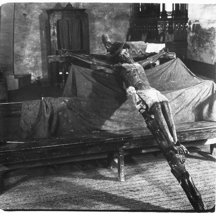 Imatge de Sant Crist, de la parròquia de Sant Miquel de Montblanc, que a la fotografia apareix preparada per a la processó, recolzada sobre uns bancs, dins la seva capella. Es tacta d'una imatge gòtica, del segle XV.