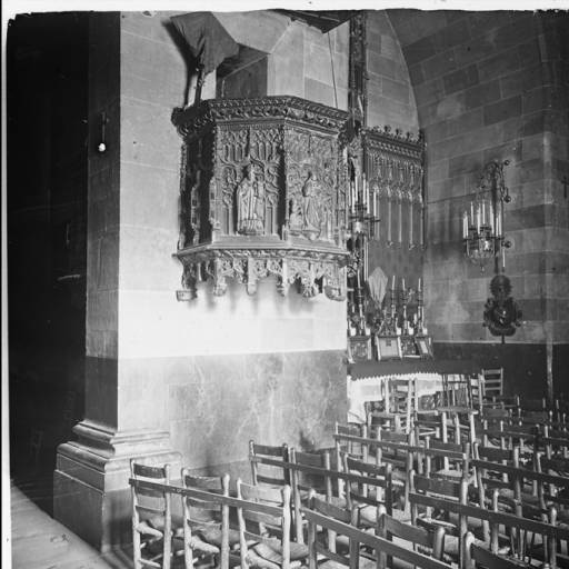 Trona de fusta amb peu barroc en forma de permòdol o cul de llàntia. Presenta un tipus de decoració de caràcter arquitectònic, amb columnes clàssiques i figures de sants (els Evangelistes?) situades en sengles edicles cadascun en una de les cares que formen l'estructura poligonal.