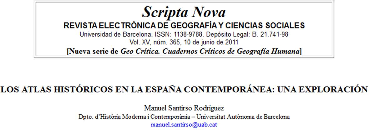 SANTIRSO, Manuel, "Los atlas históricos en la España contemporanea: una exploración", Scripta Nova. Revista electrónica de Geografía y Ciencias Sociales, vol. XV (2011). |
