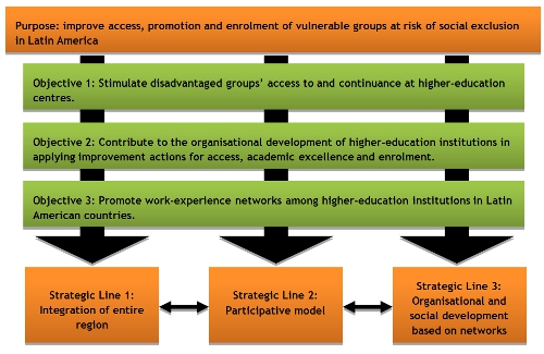 Finally, objective 3 involves qualified experimentation, in principle, and the subsequent generalisation of the model while, in parallel, fostering a work-experience network or community among those involved in the different activities developed for the inclusion and promotion of academic success among disadvantaged groups at Latin American universities. This last objective directly contributes to the institutionalisation and generalisation of the model developed, as well as promoting a Latin-American higher-education space, facilitating exchanges and connections between HEI participants in the projects.