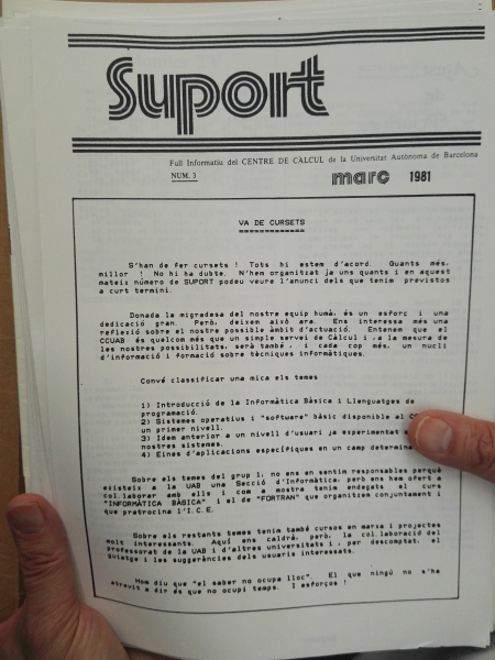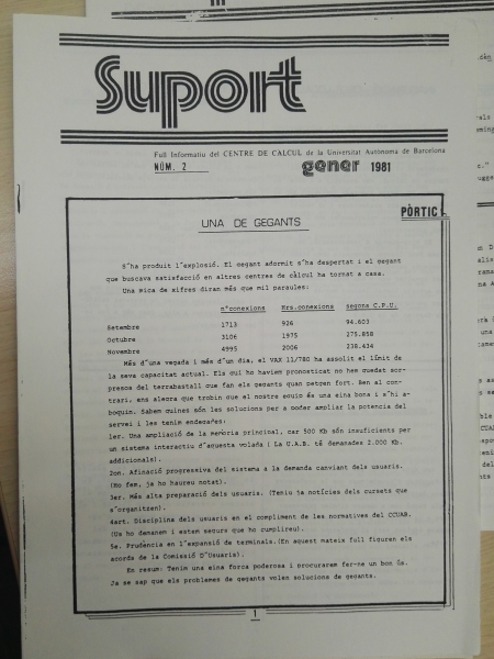 Cal dir que, a l’any 1985, mentre a la UAB es “gaudia” d’aquest recurs, a les altres universitats els estudiants de ciències exactes encara feien servir les targetes perforades, on cada targeta representava una instrucció, una lletra o una dada simple d’un programa que s’ordenava en una pila, que es lliurava a finestreta en horari feiner i es rebia el resultat al dia següent, amb errors o amb èxit, sense cap interacció amb la màquina. La UAB oferia un servei complet de suport als investigadors, amb cursets i fins i tot amb la publicació d’un fulletó.