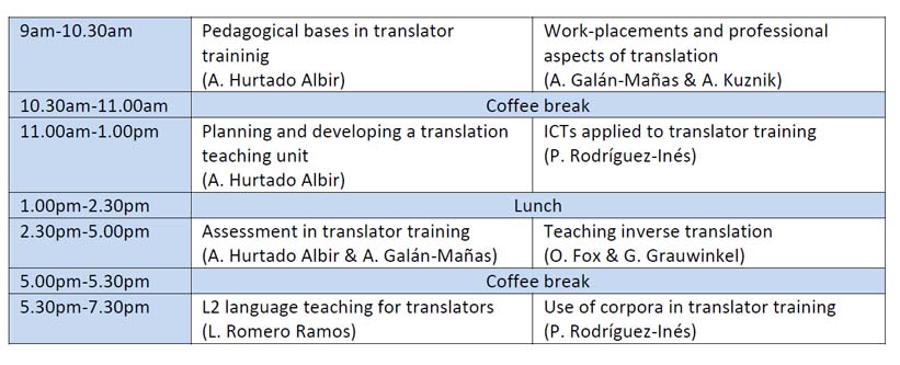 Exceptionally, this time the Seminar will be a one-day session. It will be made up of eight different modules among which participants will choose the four seminars that best suit their personal interests. The eight modules are: pedagogical bases in translator training, planning and developing a translation teaching unit, assessment in translator training, L2 language teaching for translators, teaching inverse translation, work-placements and professional aspects of translation, ICTs applied to translator training, use of corpora in translator training.