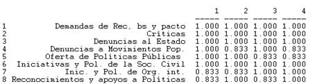 En este cuadro se puede observar que tanto piqueteros como sectores carenciados se estarían presentando como estructuralmente equivalentes si la red fuera de este tamaño, debido a que las conexiones entre ellos son de las mismas características, ambos Critican o Demandan. En tanto la Iglesia diversifica sus preferencias en una gama más amplia de temáticas.