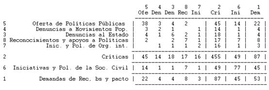 En esta tabla se pueden observar las vinculaciones entre los diferentes temas debido a que coinciden a ser mencionados por los mismos actores. Las vinculaciones que se pueden destacar son: Demandas con Críticas e Iniciativas surgidas en la Sociedad Civil. Críticas con Demandas, Iniciativas de la Sociedad Civil y Ofertas. Ofertas con Críticas y Demandas. Y por último Iniciativas de la Sociedad Civil con Demandas y Críticas.