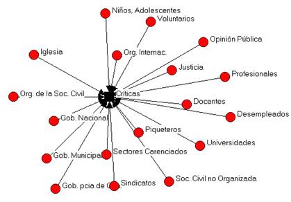 Es evidente la capacidad de movilización que pueden llegar a tener los tres actores centrales Iglesia, Piqueteros y Sectores Carenciados. La activación de cualquiera de los significantes a los que estos se dirijan comienza a articular el resto de la red. Si bien existe un grupo de actores que se encuentra vinculado por un solo significante, la fortaleza del vínculo que tienen los demás actores con el mismo (Críticas) permite la activación instantánea y a su vez su capacidad de intermediación.