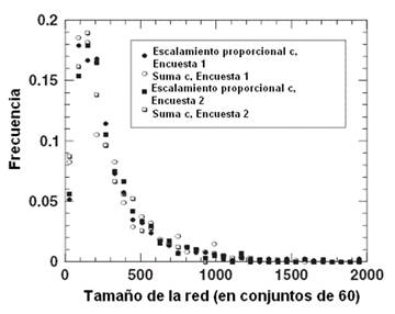 Ilustración 1. Frecuencia del tamaño de la red para las encuestas 1 y 2.Nota: Los símbolos cerrados muestran el tamaño estimado obtenido con el método de escalamiento; los símbolos abiertos, los computados con el método de suma. |