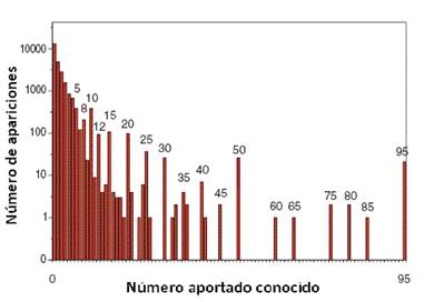 0 268 1 135 2 69 3 37 4 21 5 13 6 10 7 9 8 8 9 6 10-12 5 cada uno 13-20 4 cada uno 21-35 3 cada uno 36-68 2 cada uno 69-134 1 cada uno |