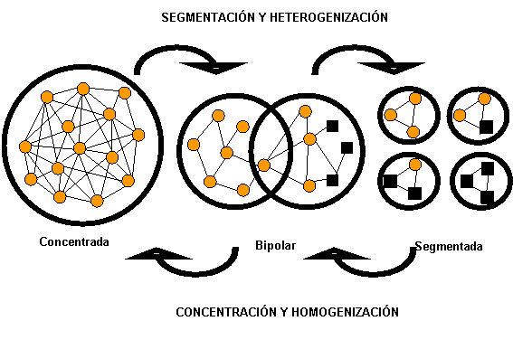 En las redes personales de los inmigrantes existe una relación entre la estructura de cluster y su composición étnica. En las dinámicas de cambio también. Es decir, un proceso de “concentración” de cluster suele ir acompañado de otro de “homogenización” en la composición de sus miembros; mientras que un proceso de “segmentación” de cluster suele ir acompañado de otro de “heterogenización” en la composición de sus miembros. El siguiente modelo representa la dinámica de estos procesos de “segmentación” y “concentración” en las redes personales de los inmigrantes. Es interesante advertir que las redes de estructura bipolar tendrían una ubicación de “transito” intermedio entre los extremos de las redes concentradas de un lado y las redes segmentadas de otro lado.