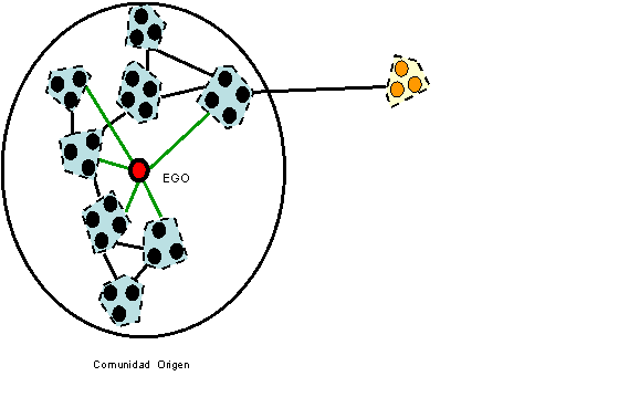 Ahora bien, “ego” tampoco establece relaciones transnacionales “al azar” con su sociedad de origen. Lo hace con personas que formaban parte de su red antes de emigrar, espacialmente con aquellos ubicados en su núcleo, cuyos nexos se habían mantenido en estado de latencia. Los contactos que establece “ego” tienen repercusiones en origen. Este pasa a ocupar una situación de “puente” entre la comunidad local y la sociedad de destino a la cual otros quisieran también emigrar. Algunos miembros de la antigua red establecen contactos con “ego” y se incorporan dentro del campo transnacional, donde se desarrolla una nueva sociabilidad entre ellos y ego.