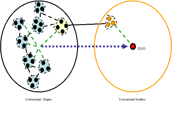 La partida de “ego” fuera de su comunidad de origen genera la desestructuración de su red en la comunidad de origen y un proceso de reestructuración nuevo en la sociedad de destino. Este proceso se desarrolla -por lo general- teniendo como punto de partida los contactos previos que ha desarrollado antes de emigrar.
