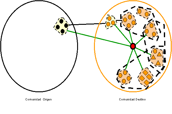 ¿Qué es lo que ocurre en la sociedad de origen? Hemos constatado dos cosas. Primero, las redes que el inmigrante reconstruye en destino en algún momento del proceso se vuelven hacia la sociedad de origen. Y en la sociedad de origen se forman nuevas relaciones con personas que anteriormente formaban parte de su comunidad personal originaria, y también con personas nuevas que desean tener algún tipo de “vínculo estratégico” con el inmigrante en el extranjero. Este proceso se explica mejor a través de la representación gráfica de la secuencia.