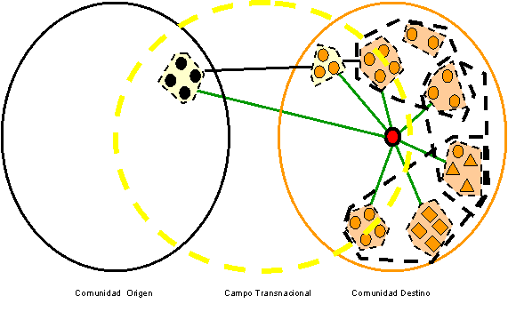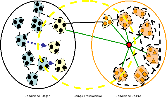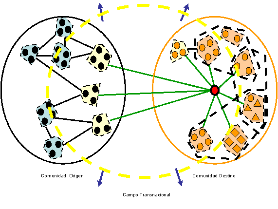 Las relaciones entre “ego” y sus alteri en destino y origen generan la constitución de lo que se denomina “campo transnacional”. Este campo tiene la peculiaridad de constituirse en función a las redes de sociabilidad que se desarrollan “ego” entre la sociedad de origen y destino.