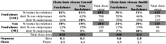 Por otra parte, las elecciones relacionales de los actores no se distribuyen de manera homogénea entre estas dos categorías. En la red de Consejo, más del 80% de las elecciones emitidas por los fundadores y los no fundadores van dirigidas a los fundadores (81% y 81%). Los no fundadores reciben solamente un 19% de las elecciones emitidas por las dos categorías. Un 20% de las elecciones emitidas por los no fundadores son recíprocos con los fundadores, mientras que solamente 3% de sus elecciones emitidas corresponden a relaciones recíprocas entre no fundadores. Esta cifra es tres veces superior en la red de Amistad (10%). De hecho, en el sentido de nuestros análisis anteriores, el nivel de reciprocidad en la red de Amistad es más elevado en todas las configuraciones a excepción de las elecciones emitidas por los fundadores hacia los no fundadores que se mantienen al 7%. En esta red, los fundadores son elegidos ligeramente menos que en la de Consejo, pero monopolizan de todas maneras más de dos tercios de las elecciones (76% y 71% para las dos categorías). Si se observan exclusivamente las relaciones recíprocas, más del 80% (20% de un total de 23% para esta configuración) de las relaciones recíprocas de los no fundadores son con fundadores, mientras que solamente 30% (7% de un total de 23% para esta configuración) de las relaciones recíprocas de estos últimos son con no fundadores. En lo que atañe las relaciones no recíprocas, solamente 15% de las relaciones de los fundadores van dirigidos a los no fundadores, mientras que más del 50% de las elecciones no correspondidas de los no fundadores van dirigidos a los fundadores.