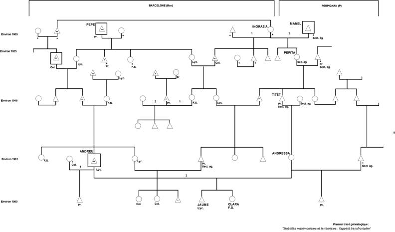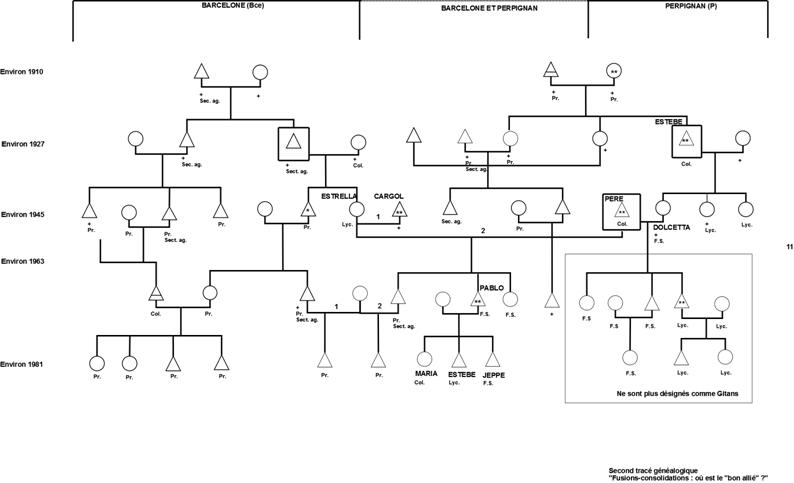 Pour cet article[10], nous présenterons plus particulièrement deux trajectoires intergénérationnelles familiales qui ont permis de comprendre comment certaines familles pouvaient préserver la transmission des savoirs faire et des apprentissages scolaires. A partir de ces tracés généalogiques nous verrons comment la famille gitane perpignanaise, et la famille gitane barcelonaise, se renforcent mutuellement en s'agglomérant en clan aux contours nouveaux, transnationaux, alors même qu'une lecture limitée par la frontière politique entre France et Espagne nous suggère la désagrégation de l'une et parfois simultanément de l'autre.