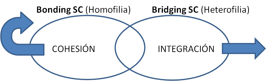 En el elemento interno del CS podemos diferenciar dos tipos de interacciones que proporcionan determinadas oportunidades o recursos en función de la posición que el individuo tiene en la estructura de la red. Estos dos tipos conforman la tipología de CS y son utilizados aquí desde una perspectiva relacional. El primero se refiere a aquellas formas de interacción “de unión” que dan lugar al Bonding Social Capital. El segundo hace referencia a las relaciones “que tienden puentes” y generan Bridging Social Capital (Woolcock y Narayan, 2000; Field, 2008).