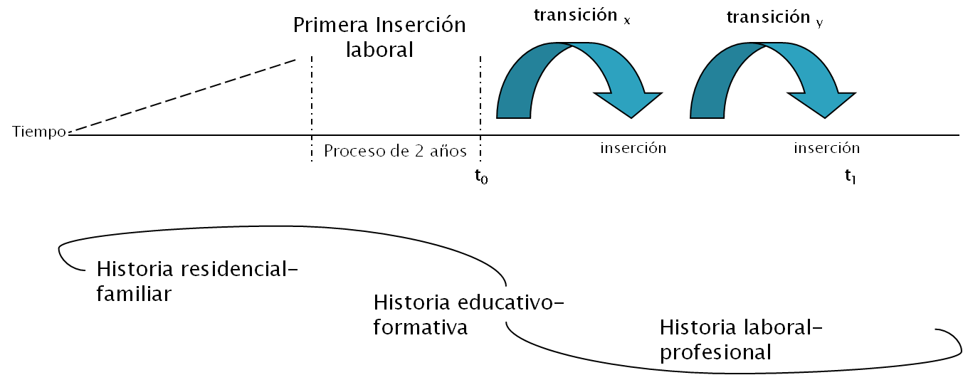 La perspectiva desde la cual se define el concepto de TL viene dada por un modelo temporal que se centra en la idea de proceso, en el cual, es imprescindible vincular la historia laboral del individuo con sus historias familiares y educativo-formativa (Godard, 1998; Muñiz, 2005). Además, cabe considerar otros factores que recogen la historia o recorrido relacional (antiguos conocidos, nuevos contactos, etc.) del individuo y que adquieren importancia respecto al acceso al empleo principalmente para colectivos como los jóvenes (Merino y García, 2007).