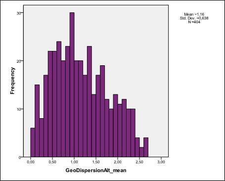 La distribución de este índice se muestra en la Figura 1, en la que se puede apreciar una concentración de los valores alrededor de la media. Esto puede ser interpretado de la siguiente forma: una minoría no tiene Alteri distribuidos fuera de su ámbito geográfico y se sitúan a la izquierda –podríamos llamarlos “locales”, por seguir el célebre artículo de Merton sobre locales y cosmopolitas (1968)-, la mayor parte de los casos se sitúan en el centro –“glocales”- y un porcentaje variable y decreciente de personas a medida que nos desplazamos a la derecha tiene características que podríamos llamar “cosmopolitas” o “transnacionales”.