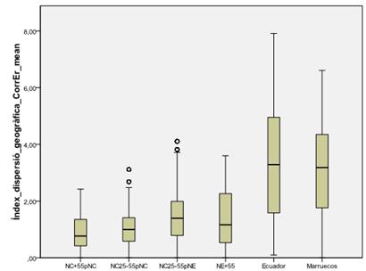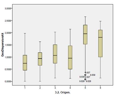 Figura 2. Diferencias en la distribución geográfica de la red personal en función del origen de los Ego según la el índice de dispersión Ego-Alter + Alter-Alter.