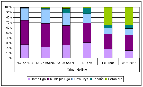 Así pues los tres índices son consistentes entre sí e indican la existencia de dos grandes realidades diferenciadas en lo que respecta al comportamiento en la distribución geográfica de las redes personales: la de la población nacional o autóctona (nacidos en Catalunya o en el resto de España) y la de la población extranjera.
