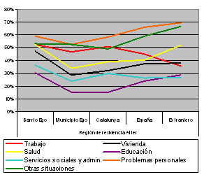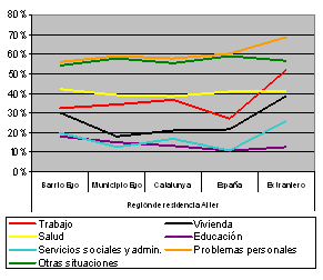 La Figura 9 muestra, para los extranjeros, como los Alteri con los que se intercambia una proporción de apoyo mayor son los que residen en el extranjero, con la excepción del apoyo relacionado con temas de trabajo y, en menor medida, de vivienda y servicios sociales y administrativos. También se observa cómo aquellos Alteri que residen en el mismo barrio de Ego en general intercambian apoyo con éste en una proporción mayor que con los que residen en el resto del municipio. Finalmente, una comparativa entre los autóctonos y los inmigrantes muestra cómo los inmigrantes intercambian una proporción bastante mayor de apoyo (entre un 15 y un 20% más) en lo que atañe a la obtención de empleo o información útil en temas de trabajo, vivienda y servicios sociales y administrativos, con los Alteri que residen en todas las regiones del país de destino.
