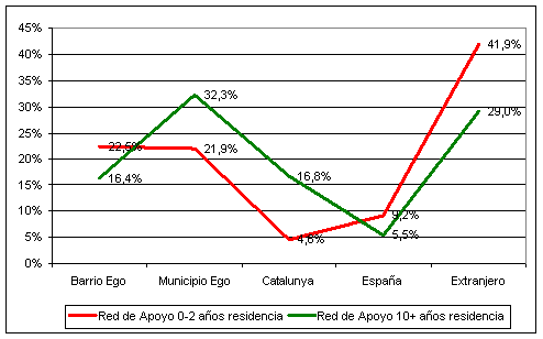Finalmente, haciendo un análisis de la evolución de la distribución geográfica de la subred de apoyo según el tiempo de residencia de la población inmigrante en Catalunya, la comparativa entre aquellos inmigrantes recién llegados respecto aquellos que llevan diez años o más en Catalunya nos muestra que hay cierta evolución en la distribución geográfica de la red de apoyo a medida que pasa el tiempo. Se observa cómo, en una primera etapa del proceso migratorio, se dispone de más Alteri en el extranjero que en el país de destino, mientras que a medida que pasa el tiempo la proporción se invierte, incrementando especialmente los contactos con personas del municipio.