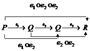 Entre los morfismos, podemos distinguir los morfismos generadores, ek, que son los elementos de E, y los morfismos compuestos, cadenas de morfismos generadores. Entonces, en nuestro ejemplo, tendremos un morfismo compuesto e1_e2 de P a P.
