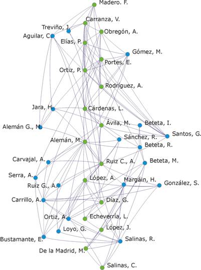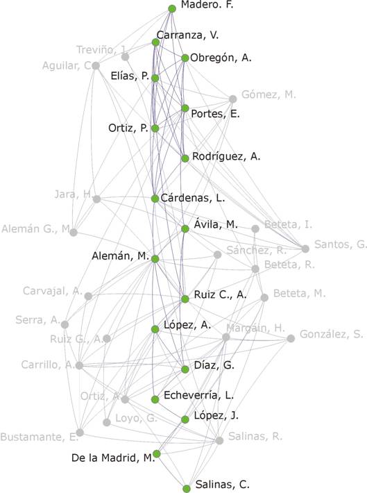 En la Figura 1 se muestran los 37 personajes que se consideraron para el estudio. En la parte central se localizan los ex-presidentes(nodos verdes) en forma cronológica empezando con Francisco I. Madero. Para el análisis longitudinal se tomaron periodos de diez años.