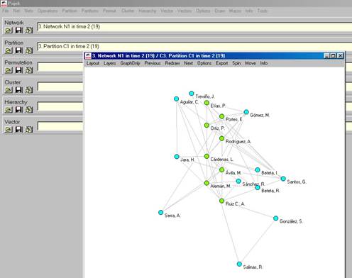 Si para la red se definió un partición, Pajek genera una partición para cada una de la redes correspondientes a cada periodo. En este caso la partición se hizo tomando en cuenta a quienes fueron presidentes (nodos verdes) y quienes no fueron(nodo azules). Figura 3.