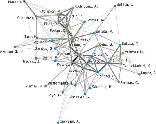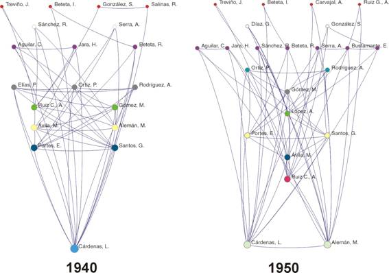 “La red de poder mexicana logró una gran cohesión que con el paso de los años se ha ido minando. Los actores políticos contemporáneos han perdido cohesión, lo cual se muestra con valores de centralidad más bajos de los alcanzados por los actores que iniciaron la red ... En México dos grupos de la red de poder han dominado al sistema político desde 1920, compitiendo entre ellos y definiendo sus trincheras alrededor de funciones sistémicas. Uno de los grupos está identificado con antecedentes militar-revolucionarios y posiblemente por eso con una agenda social muy clara, y el otro con el manejo de las finanzas, por lo cual seguramente ven la función gubernamental como una cuestión de eficiencia.”[4]