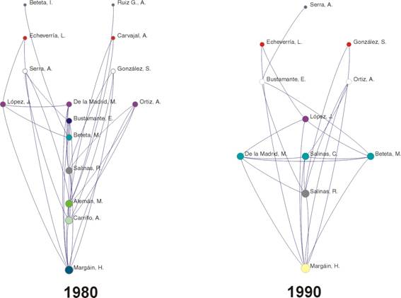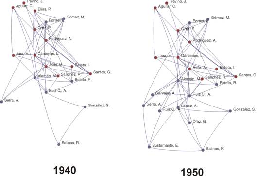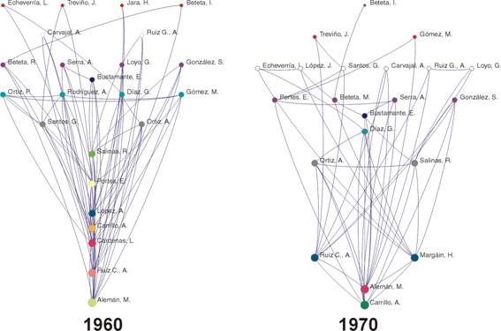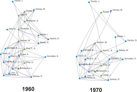 En las Figura 5a, 5b y 5c es notoria la presencia de Miguel Alemán Valdés en la red, su influencia se muestra a partir del corte del año de 1940 hasta el corte del año de 1980, otros dos actores que destacan por su permanencia dentro de la red son Raúl Salinas Lozano y Salomón González Blanco.